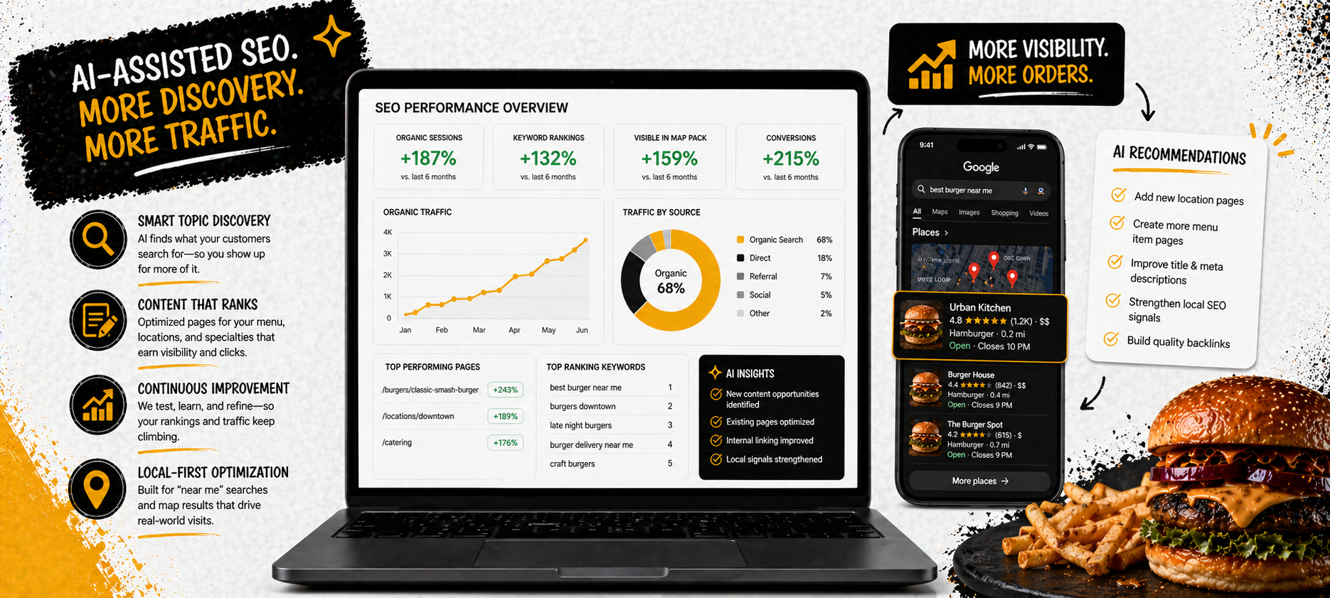 Outbites SEO is tuned for local intent, so you capture hungry searches around your restaurant, not just generic national traffic.