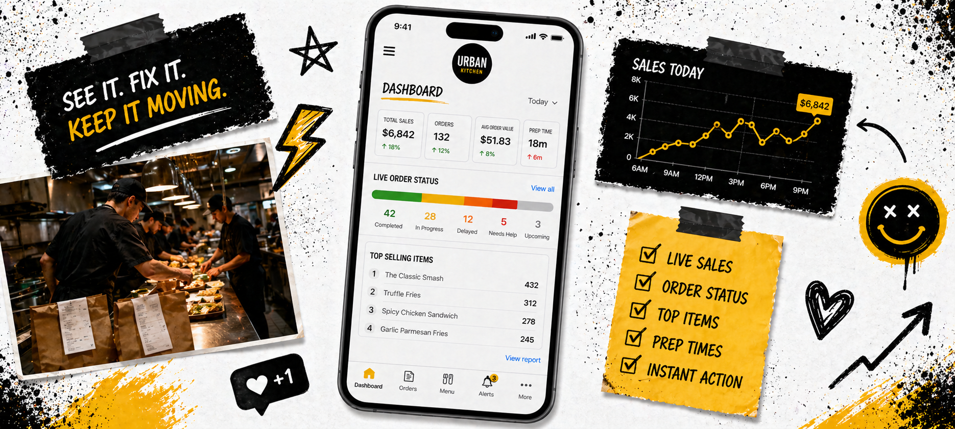 Push and SMS alerts fire when prep times spike, tickets age, or an integration misfires, so you fix issues before one-star reviews appear.