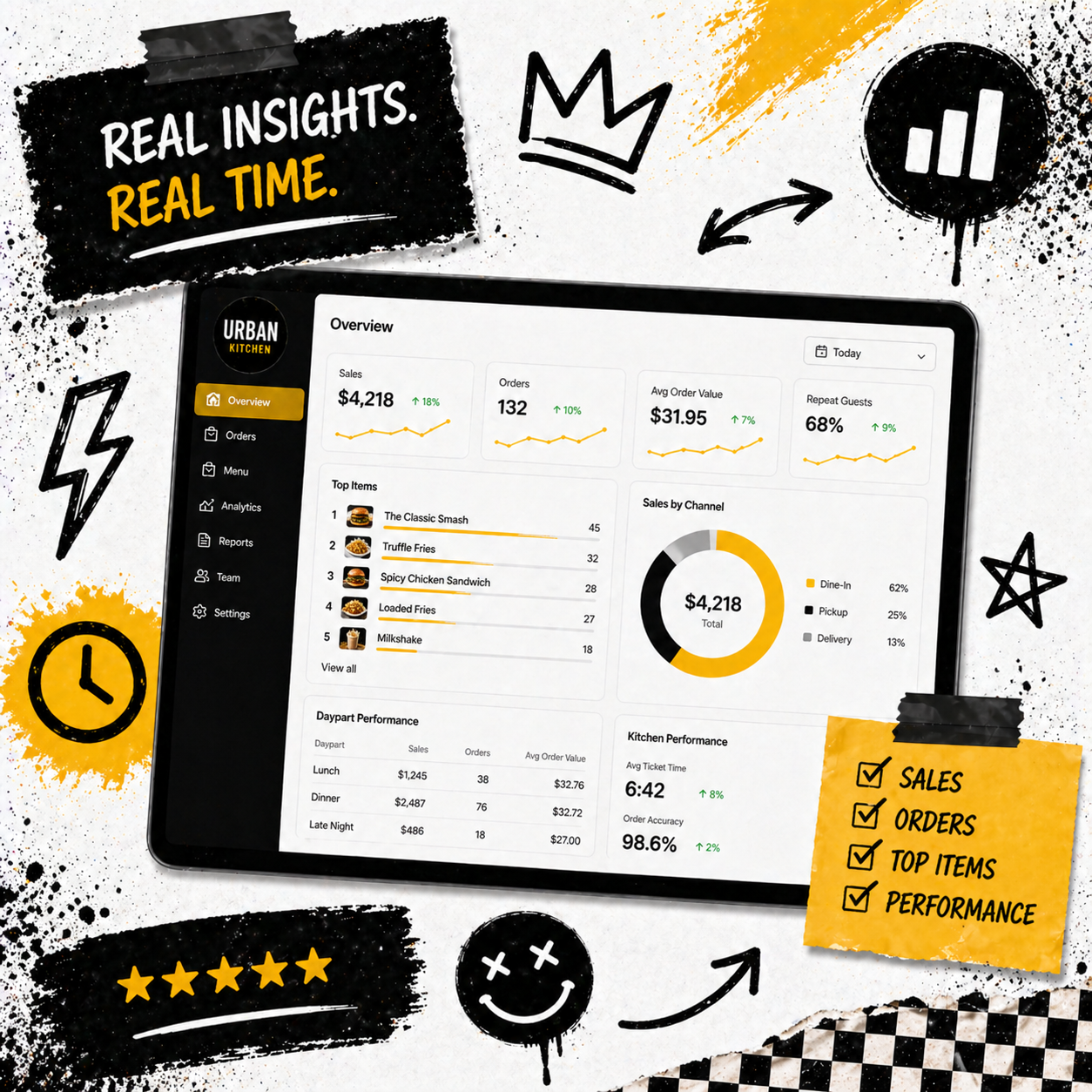 Push and SMS alerts fire when prep times spike, tickets age, or an integration misfires, so you fix issues before one-star reviews appear.